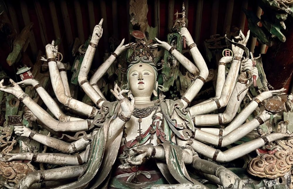 ▲ 黑神话.悟空取景点“东方彩塑艺术宝库”,唐槐、宋碑、明钟、壁画交相辉映,构成一方胜境