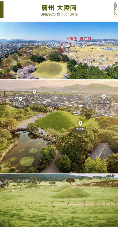 大陵苑:庆州一日游人气王陵群,漫步在青翠的古墓丘陵间,体验新罗王室的历史与庄严。