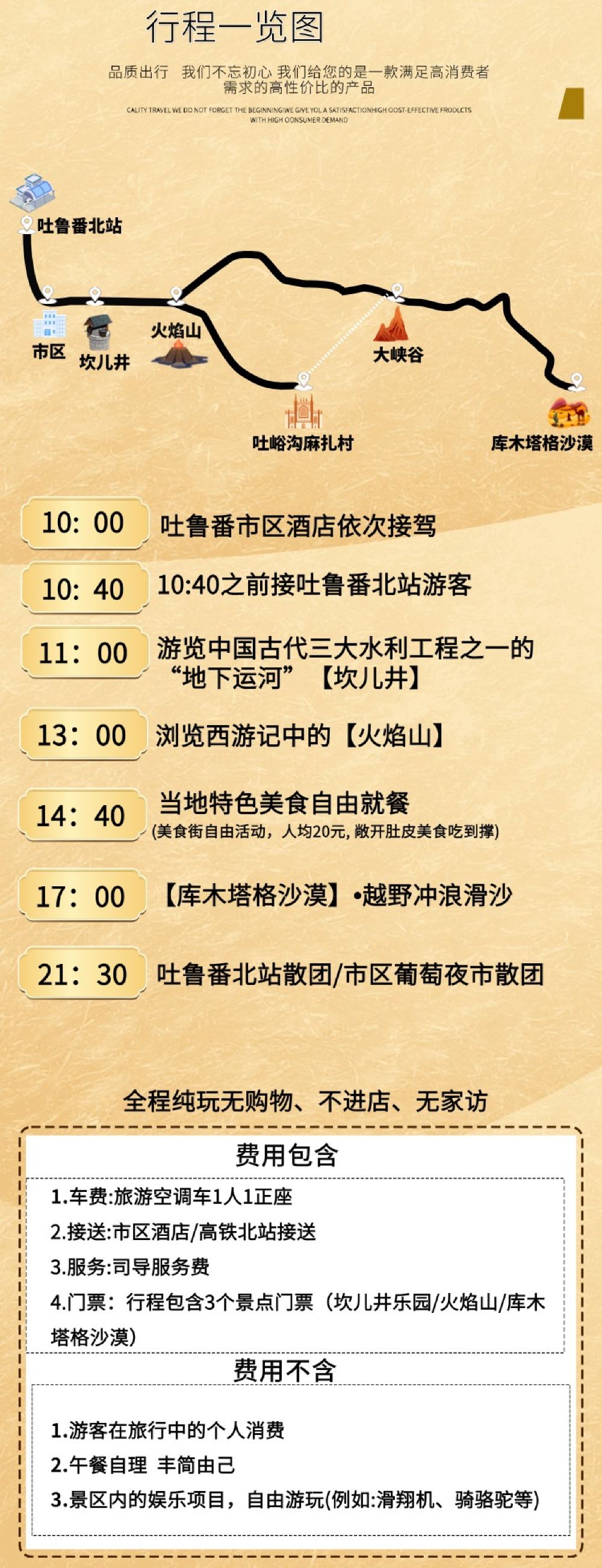 吐鲁番坎儿井+火焰山+火焰山大峡谷+库木塔格沙漠一日游【【多重玩法】多种团形,上门接送减少等待时间、漫步热门景点,登顶火焰山、体验沙漠冲浪。】
