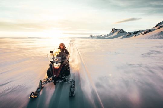 ▲ 下午继续乘坐超级吉普前往冰岛高地,穿越崎岖的地形,到达白雪皑皑的朗格冰川。您可以选择在这里体验刺激的雪地摩托之旅。当您快速穿过冰面时,会感受到肾上腺素的刺激,周围环绕着高耸的山脉和冰川。【请注意】自驾雪地摩托需携带有效驾照。单人出行或多人订单中的奇数游客请选择“单人单车”。每位成人驾驶者最多可以携带1名儿童参团。