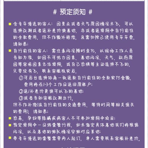 ③ 大人小孩如需一起飞,大小同价,需拍2份,且应根据基地实际风况同基地沟通飞行