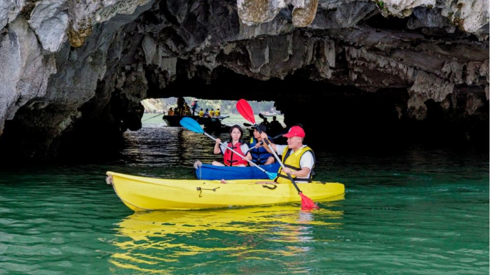 ▲ 划着皮划艇穿梭于洞穴和石灰岩地貌之间,近距离感受下龙湾的奇观。