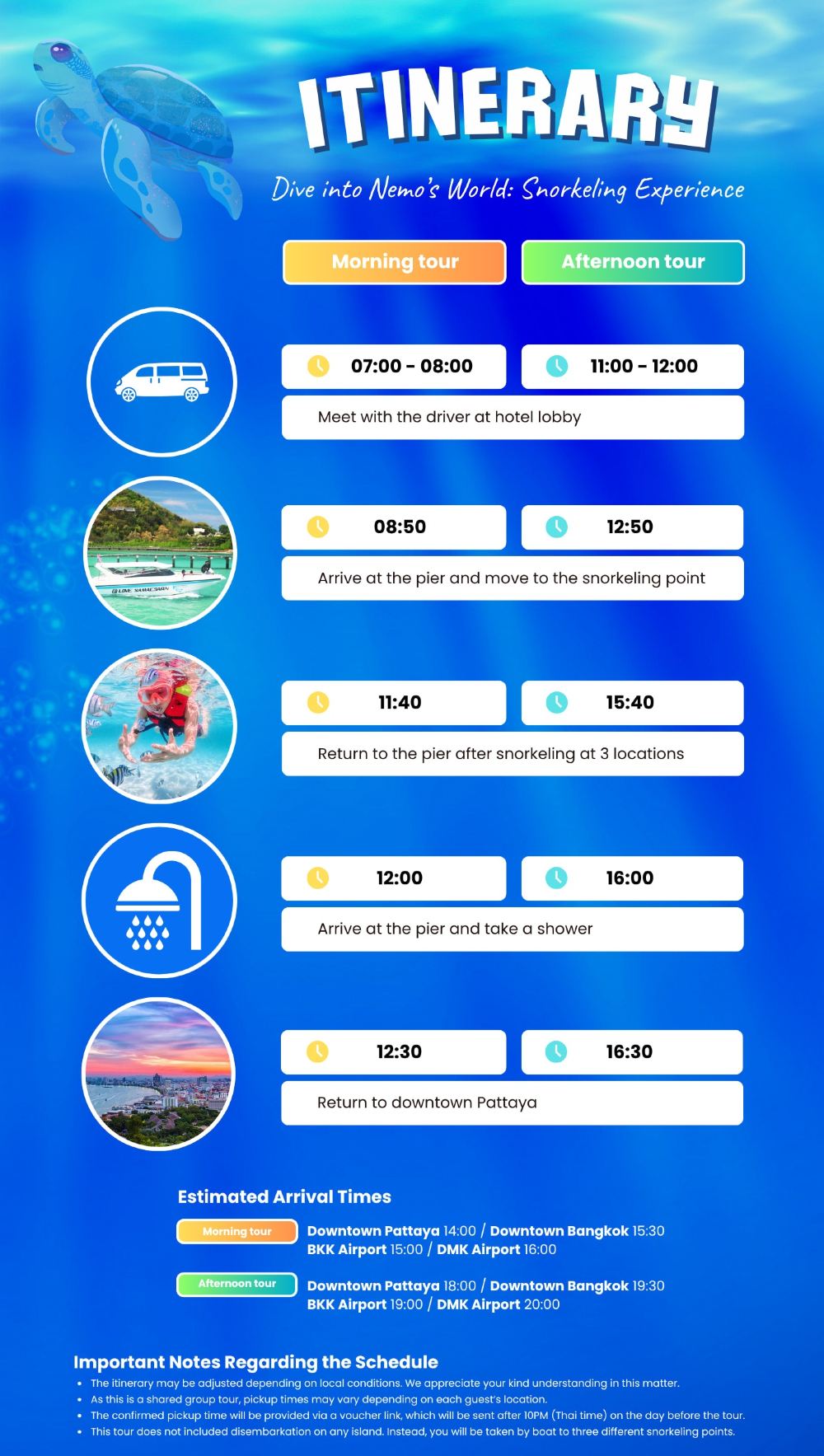 您的一天从酒店接载并转移到码头开始。享用完轻松的午餐后,您将前往周围好的浮潜点,在那里您可以与成群的鱼一起游泳,拍摄难忘的水下照片,或者只是漂浮并享受海洋氛围。无论您是第一次浮潜还是经验丰富的海洋爱好者,这次旅行都将带来乐趣、美丽和终生难忘的回忆。