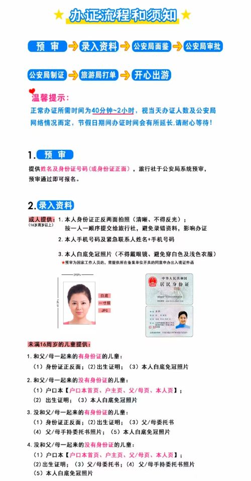 ▲ 办证须知: 1、请提供证件号码预审(免费),提前1天提供准确的游客身份资料,16周岁以下小孩户口本扫描件,如需报备的按固定格式开证明,领导签字,留座机电话并以电邮形式发送到我公司。 2、过境当天,请随身携带本人有效原件(小孩需携带户口本原件+出生证明),报备人员需携带证明原件。