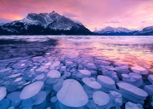 亚伯拉罕湖位于加拿大落基山脉,以冬季时被困在湖冰面下的醒目冰冻气泡而闻名。 这种自然现象创造了令人惊叹的视觉效果,使其成为摄影师和自然爱好者的热门地点。 亚伯拉罕湖被白雪皑皑的山峰所环绕,提供宁静如画的冬季景观。