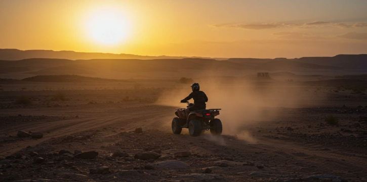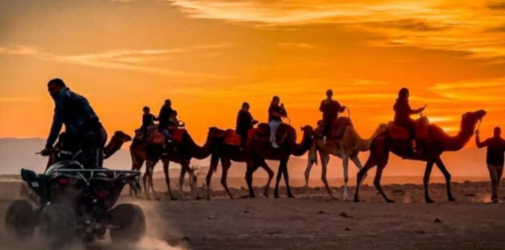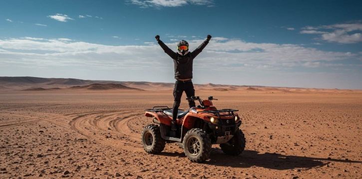 在阿加泰沙漠(Agatay Desert)开启惊险刺激的四轮摩托车探险之旅,征服沙丘,欣赏迷人的风景。之后,在游牧帐篷的舒适环境中品尝传统的摩洛哥晚餐。 首先从您在马拉喀什(Marrakech)的住宿处接您。乘坐巴士前往四轮摩托车探险的起点。抵达后,您的导游将全面介绍四轮摩托车的操作方法和当天的行程。 出发前,花一些时间在宽敞的场地练习。 跟随您的导游进入沙漠,骑着四轮摩托车征服沙丘,以阿特拉斯山脉为壮丽的背景。在几个地点停下来,拍摄周围美丽的自然风光,留下难忘的照片。