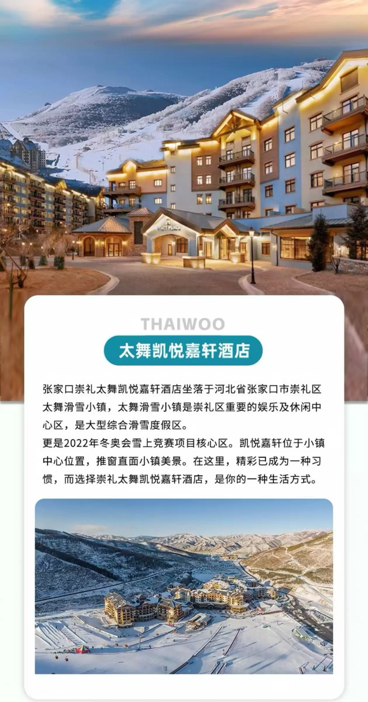太舞滑雪小镇凯悦嘉轩酒店1晚+太舞滑雪场1天雪票(不含雪具)+恒温泳池+早餐+高铁接驳+园内摆渡车+免费停车