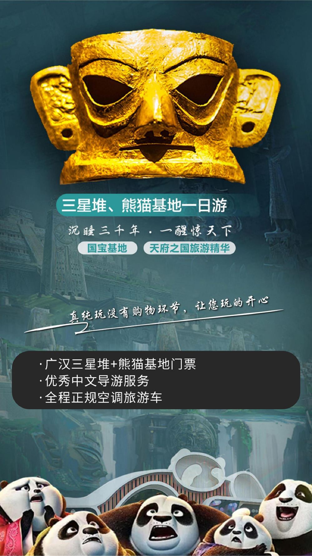 2、门票:成人包含门票:三星堆+熊猫基地(B套餐不含门票,若自己购买门票请下单B套餐。若三星堆无票替换为金沙遗址,敬请理解)。
