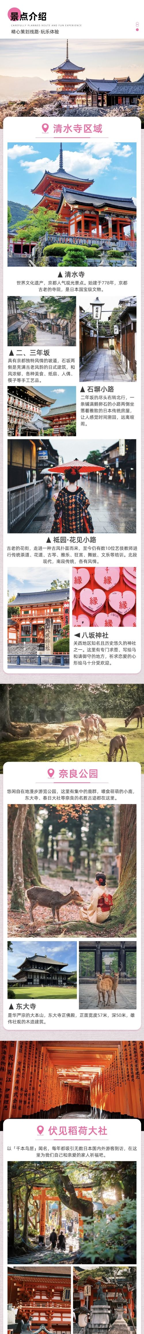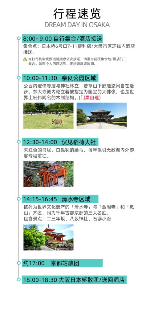 景点明细 奈良公园/东大寺-游览 90 分钟;伏见稻荷大社-游览 90 分钟;清水寺区域-游览 150 分钟