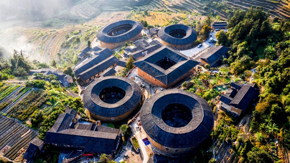 ▲ 俯瞰田螺坑全景——一方、三圆、一椭圆五座土楼,宛如“四菜一汤”,是摄影打卡的地标