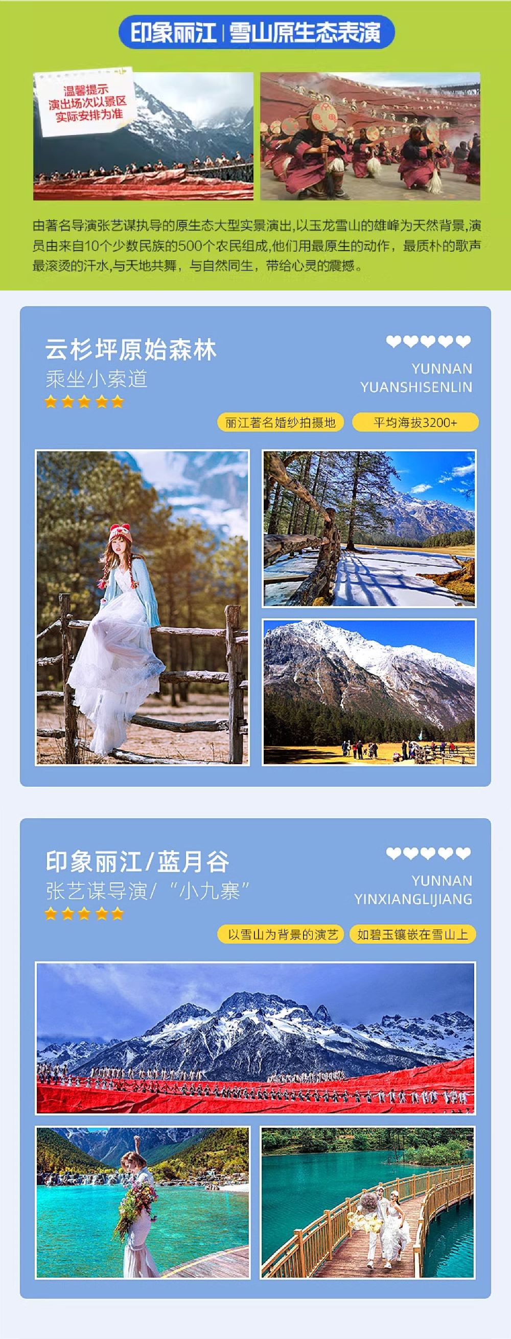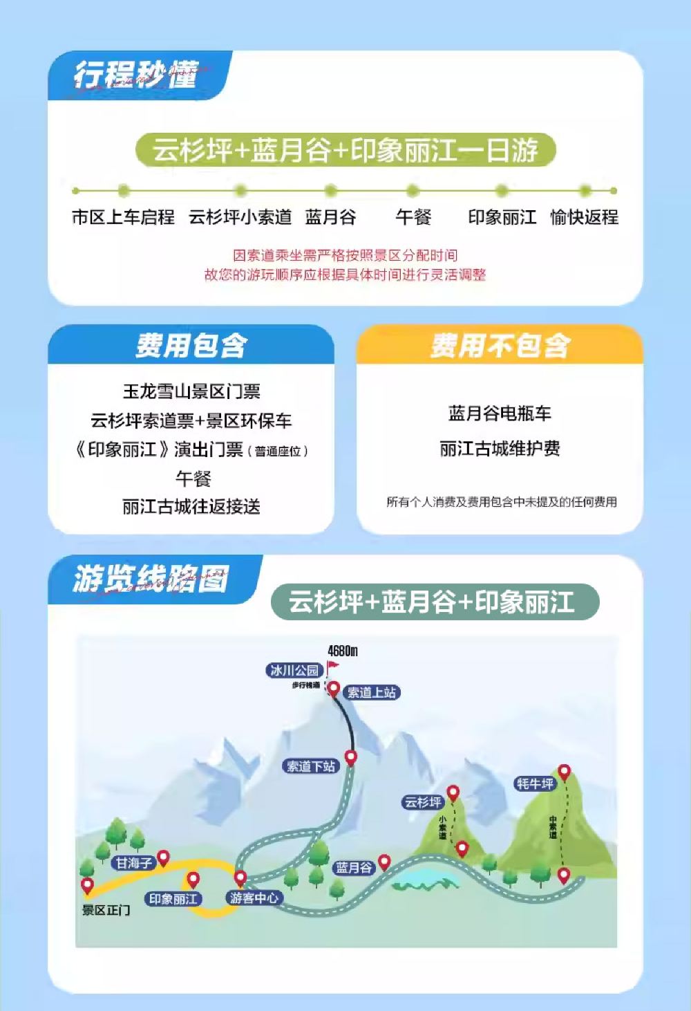 ②索道时间以系统审核为准;人为无法指定时间,本产品为小索道,去的是玉龙雪山的云杉坪+蓝月谷+印象丽江演出,请看好在下单!