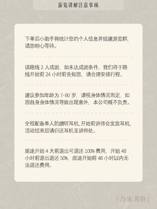 ▲ *本行程讲解2人成行,15人封顶,每位配备不入耳耳机(6周岁及以下不收费) *下单后客服将会添加您的微信,请注意查看微信消息,英文讲解需再次确认时间请您知悉 *我们是杭州本地专攻历史人文类路线团队,名家汇集,欢迎查看更多路线产品