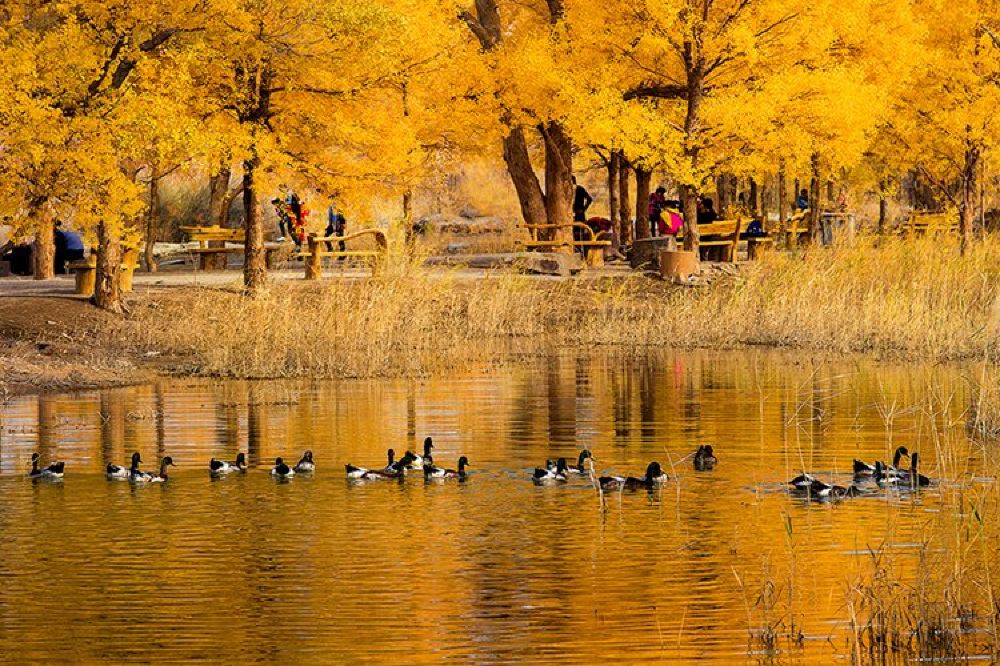 金塔沙漠胡杨林景区位于甘肃省酒泉市金塔县城以西的潮湖林场,属三北防护林体系,总面积达8万余亩,由胡杨林-金波湖核心游览区、沙枣林观光区等五大功能区构成,分布着西北地区的人工胡杨林群落,秋季树叶金黄时形成"碧云天,黄叶地"的独特景观。景区内胡杨属第三纪残余古老树种,具有耐寒、耐旱特性,形成"活三千年不死"的生态奇观,金波湖水域与胡杨林交相辉映,另有沙枣、红柳等植物构成的多样生态体系。
