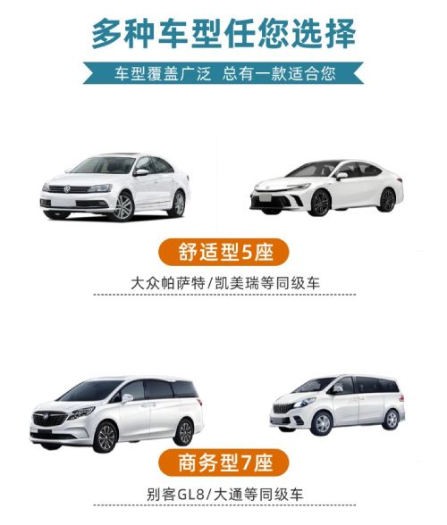 4人以下5座舒适型B级轿车,4人以上安排7座商务别克或同级MPV车型。