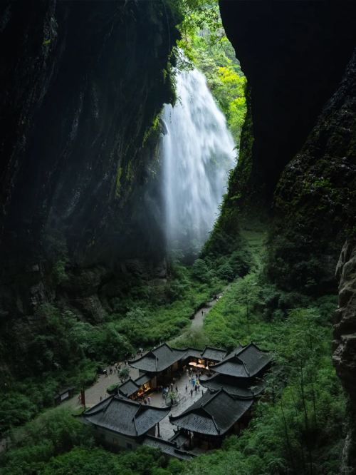 古朴雅致的传统建筑错落有致,黛瓦飞檐,在葱郁草木的环抱中更显静谧悠远 。这里的一砖一瓦,都仿佛承载着时光的记忆,与雄奇壮美的自然景观相互映衬,构筑出一幅亦幻亦真的山水人文画卷