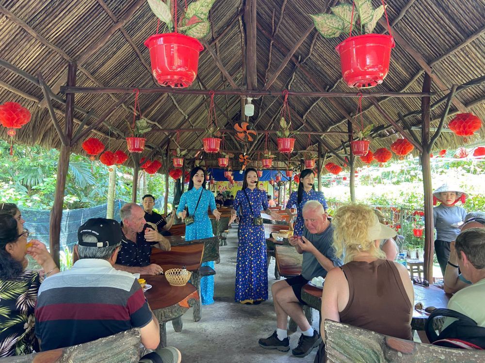 ▲ 过了Rạch Miễu大桥后,我们将抵达 Thới Sơn岛。沿着乡间小路悠闲漫步,参观当地民居和果园,一边品尝当季新鲜水果,一边聆听南部民间音乐表演。