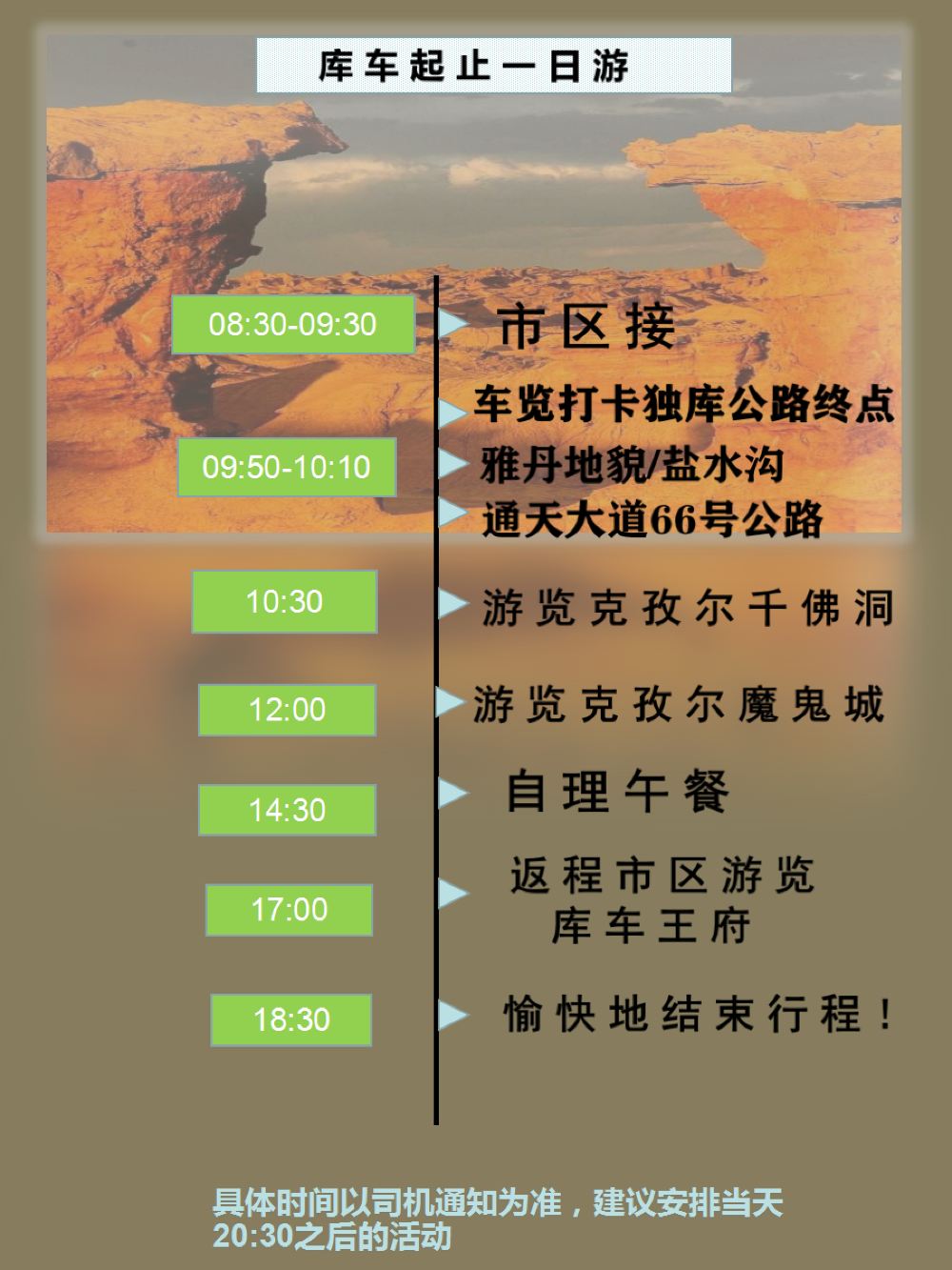 本行程为库车市起止线路,非阿克苏市起止,望须知。请自行前往库车市参团。
