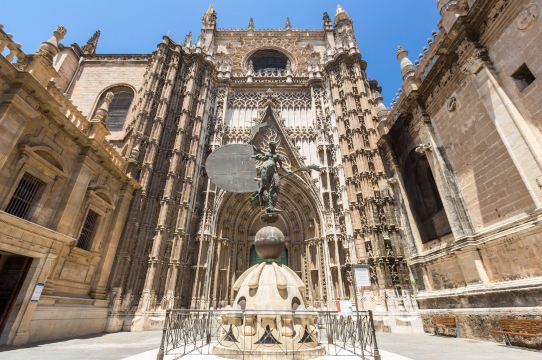 ▲ 塞维利亚大教堂内还存放着哥伦布的灵柩及其纪念像,由卡斯蒂利亚、莱昂、纳瓦拉、阿拉贡四位国王骑士雕像扛起。吉拉尔达塔也是塞维利亚大教堂的亮点之一,为当摩尔人统治时建造的清真寺塔楼,高98米,您可以沿着略为陡峭的楼梯登至塔顶,一览塞维利亚城风光。