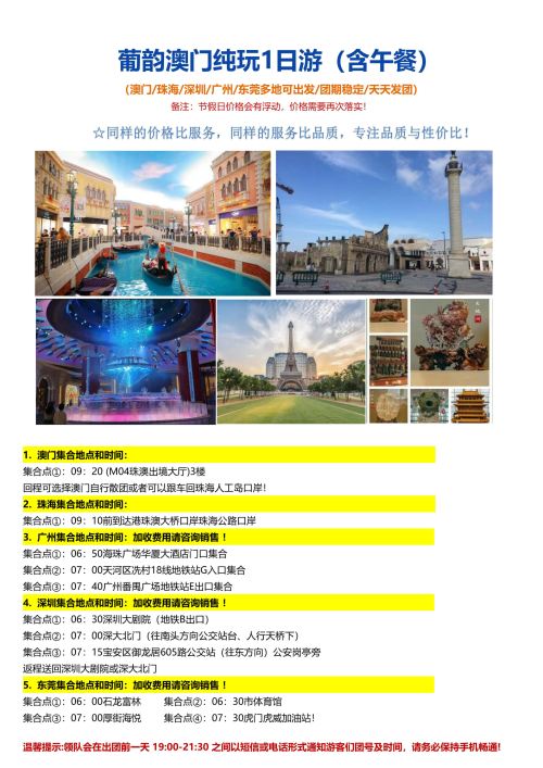 葡韵澳门6大景点纯玩1日游丨赠送流量卡+含午餐丨45人团【[贴心赠送]赠送流量卡+全程旅游保险!】