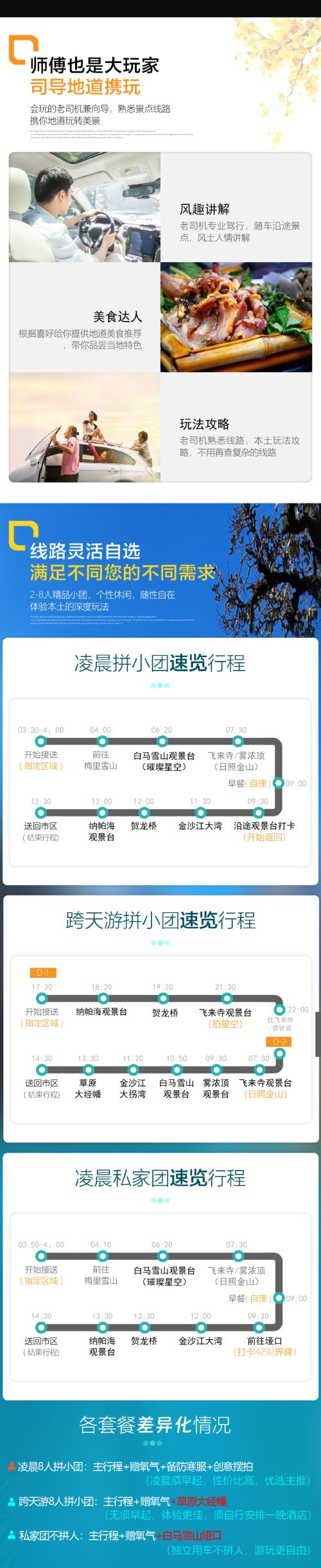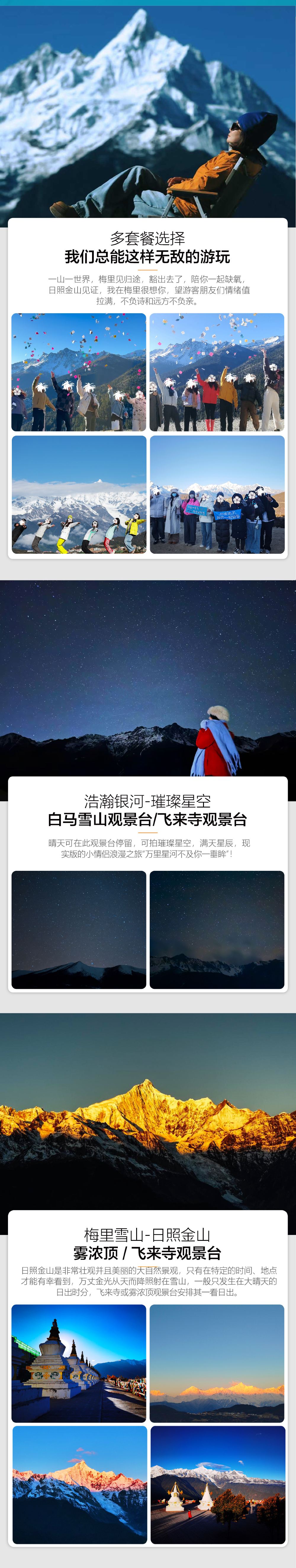 备注:凌晨套餐和跨天游套餐所走的景点都是一样,私家团多着个白马雪山垭口景点,跨天游相当于提前一天下午去到德钦县或飞来寺自行入住,就不用当天凌晨赶路了,适合不想凌晨早起的游客群体;