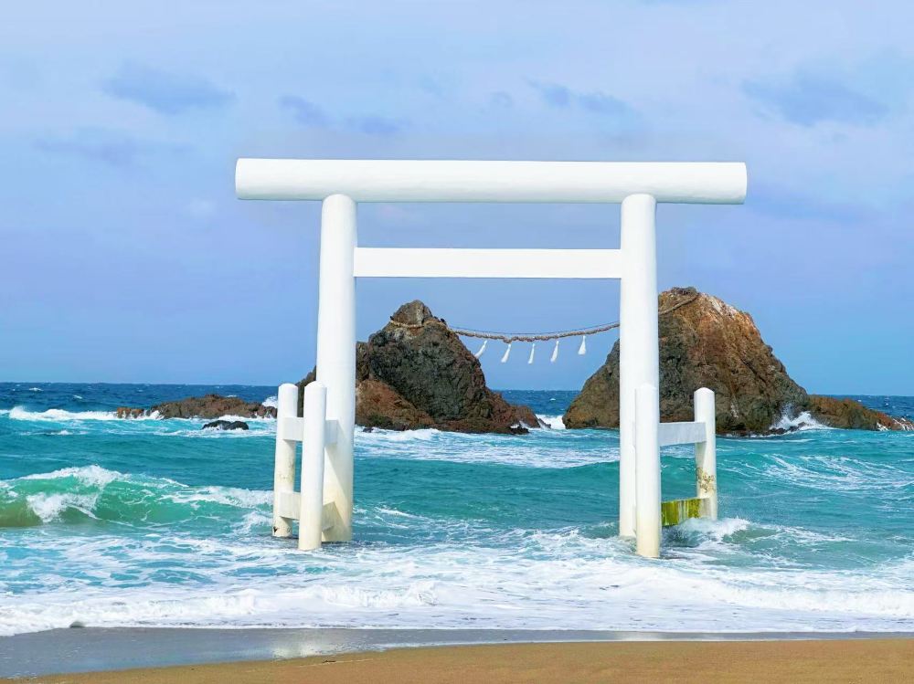 ▲ 【 樱井二见浦 夫妇岩】 以美丽的夕阳而闻名,又被称为「夕阳的二见浦」。夫妇岩的巨石依偎在白色的鸟居后面,约150米离海岸线处,这里的“夫妇岩”由两座岩石组成,象征夫妻和谐,连接岩石的注连绳在每年春末夏初的大潮时节系上,成为一道独特的风景线。