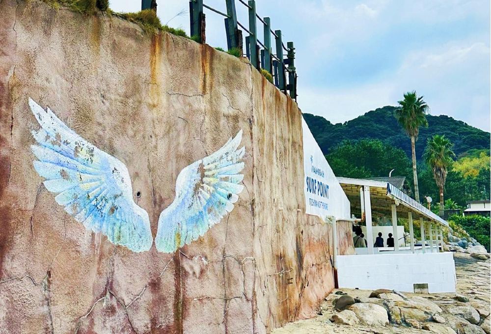 ▲ 【天使之翼】位于福冈县糸岛市樱井二见浦的PALM BEACH,是一个融合海滩、商业设施和艺术装置的热门景点。其中,天使之翼(Angel Wings)壁画成为了游客和摄影爱好者的打卡圣地。 这幅壁画位于PALM BEACH海滩旁的挡土墙上,描绘了一对色彩斑斓的天使翅膀,成为了社交媒体上的热门拍照背景。特别是在夕阳西下的时刻,翅膀的轮廓与海天一色的景色交相辉映,呈现出梦幻般的美景。
