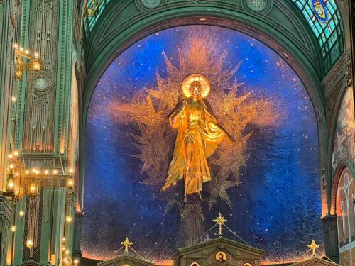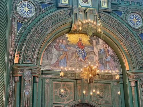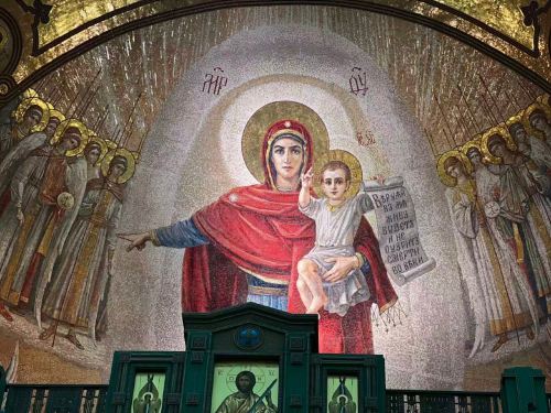 ▲ 教堂采用东正教传统风格与现代元素结合的设计。其外部以深绿色为主调,这是俄罗斯陆军制服的颜色。建筑外立面和内部装饰充满了军事元素,例如壁画内容多为战争场景,取代了传统的圣经故事。 一些建筑材料具有特殊意义:教堂的部分金属台阶和地板是由缴获的德军武器装备熔铸而成。内部精美的马赛克壁画面积达2644平方米,对应着战争期间获得荣誉勋章的人数。