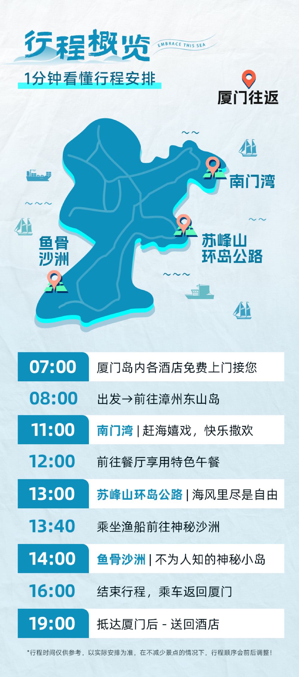 备注:鱼骨沙洲会根据每天的潮汐时间进行上下调整,故整个行程时间会有所变化,具体以导游通知为准,请您知悉!
