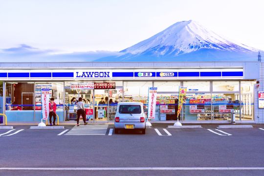 ▲ 富士山与罗森便利店的组合已成为日本旅游的热门打卡点,从便利店门口望去,富士山仿佛从屋顶升起,蓝白招牌与雪顶富士山形成经典构图,成为INS爆红机位。