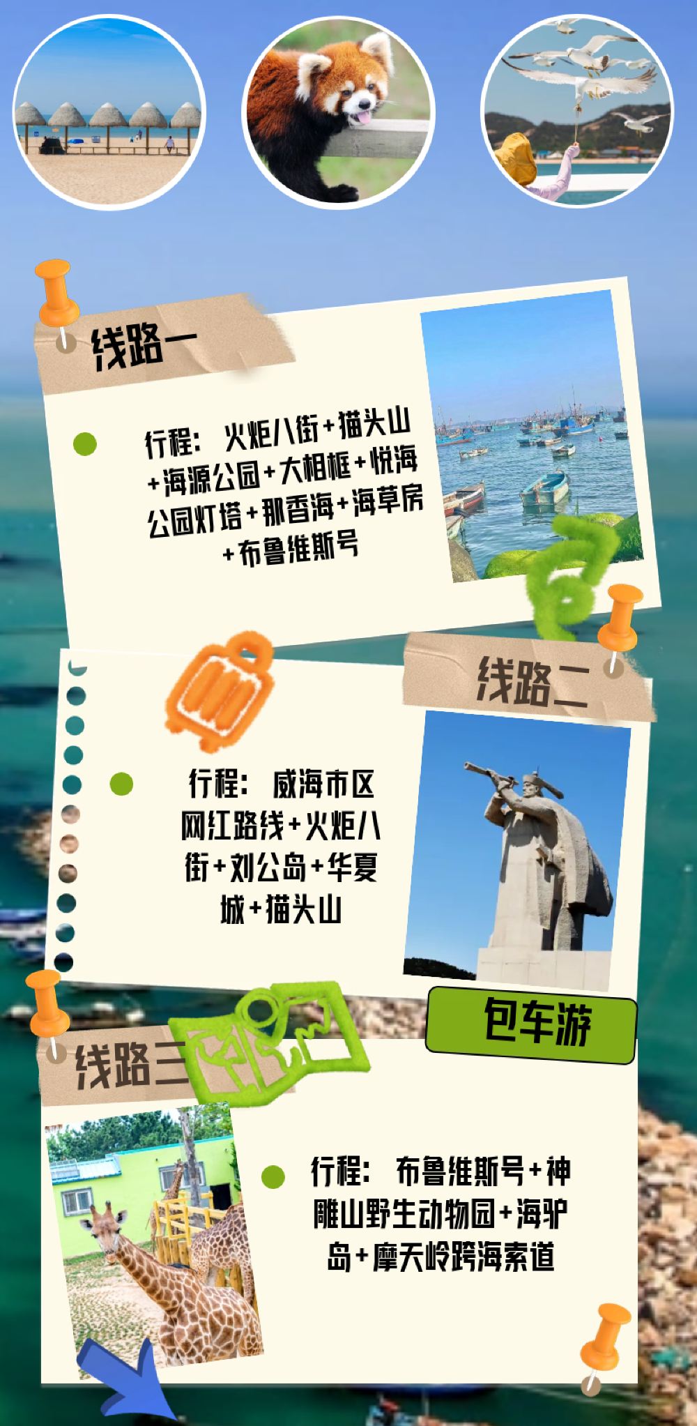 威海市区网红路线包含景点:火炬八街、金海湾栈桥、国际海水浴场、猫头山、伴月湾、海源公园、幸福门、大相框、灯塔、刘公岛、华夏城、海洋馆、神游华夏等(景点自由选择及组合游玩)