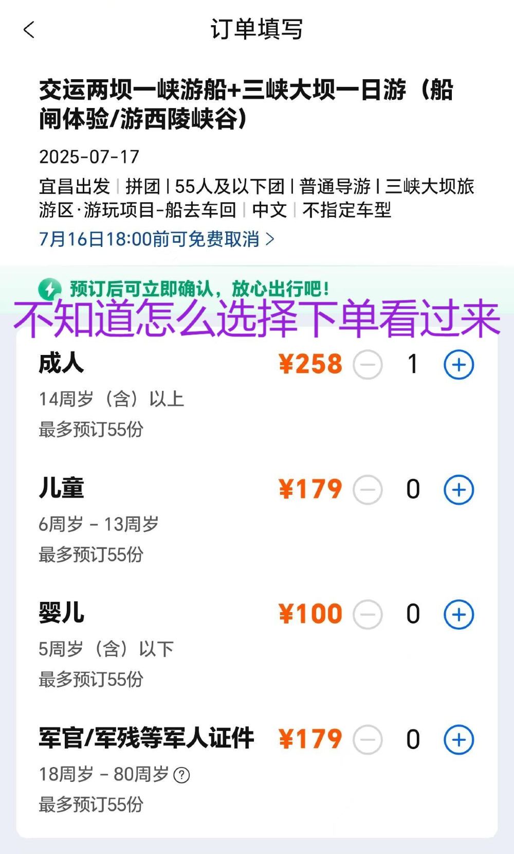 【优选】两坝一峡游船+三峡大坝一日活动(船闸体验/游西陵峡谷)【【优惠人群】6-13周岁(含)现役军官/退役军官/士兵证/退伍证等军人相关优待证件可用。】