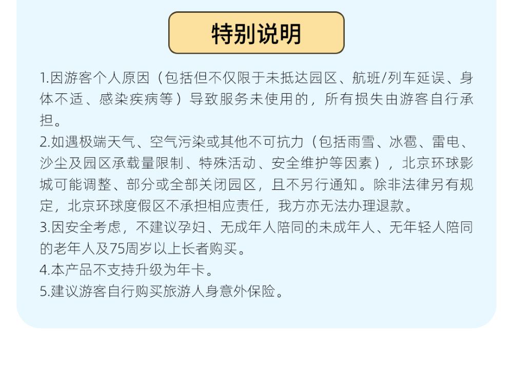 2.如遇极端天气、空气污染或其他不可抗力(包括雨雪、冰雹、雷电、沙尘及园区承载量限制、特殊活动、安全维护等因素),北京环球影城可能调整、部分或全部关闭园区,且不另行通知。除非法律另有规定,北京环球度假区不承担相应责任,我方亦无法办理退款。