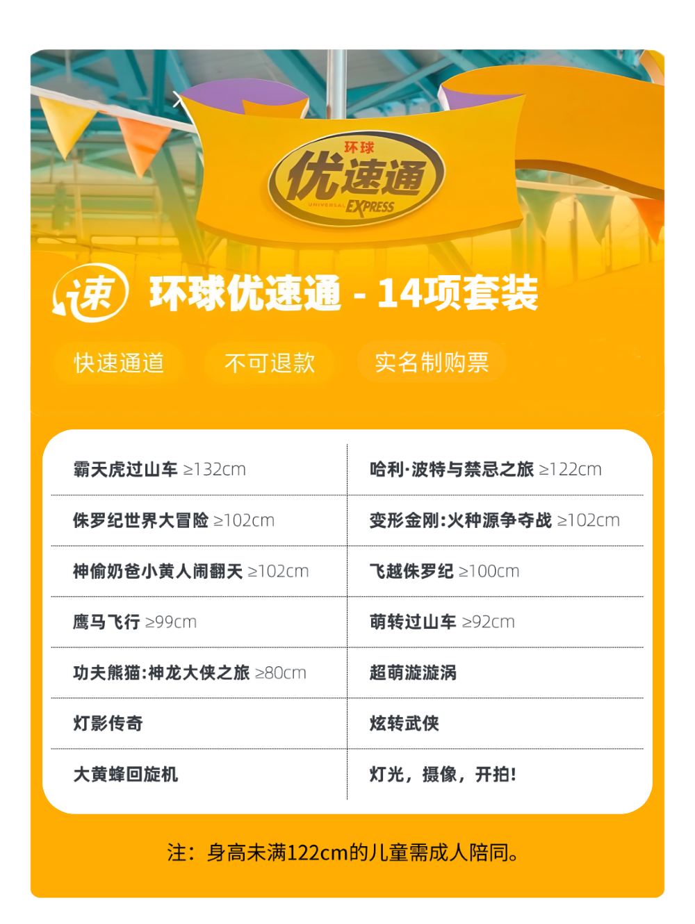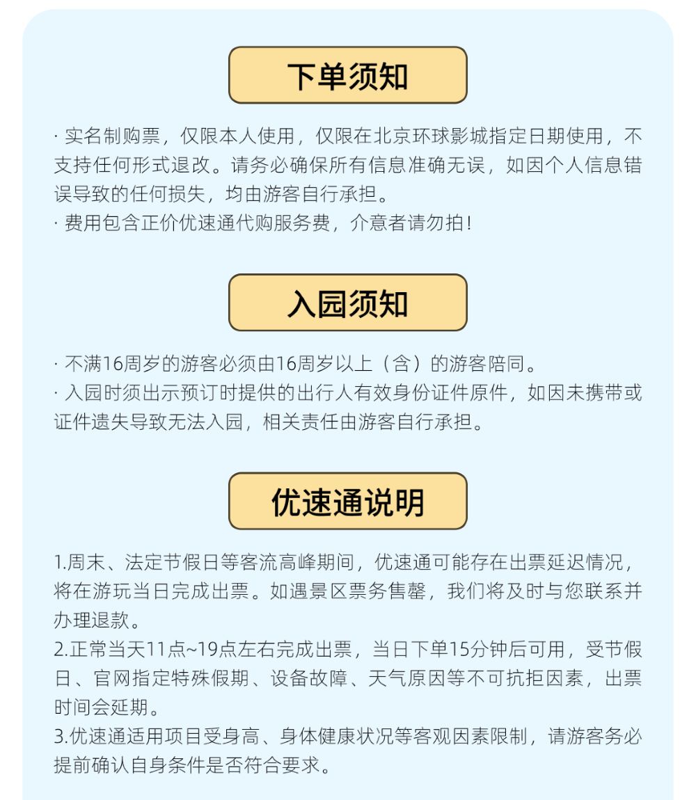 2.优速通适用项目受身高、身体健康状况等客观因素限制,请游客务必提前确认自身条件是否符合要求。