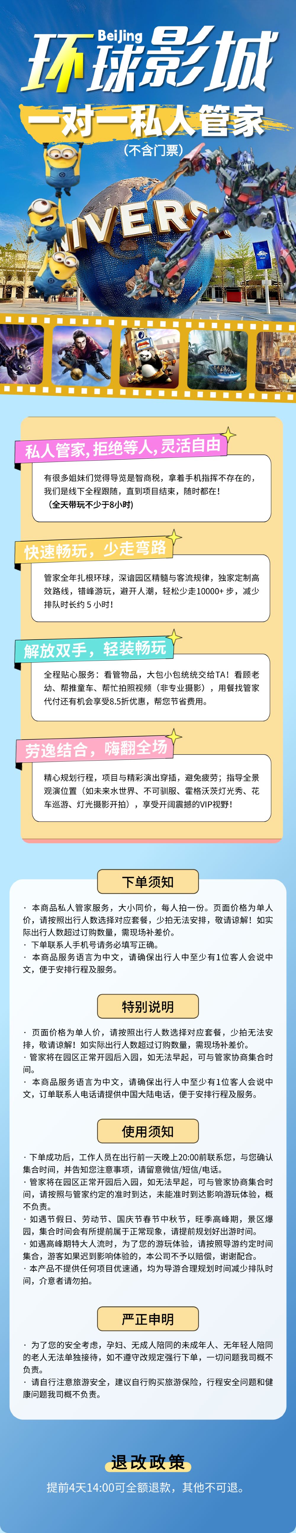 3、一对一私人管家带玩服务:适合不想拼团的人群,可以不用早起,一个导游只接待一组游客,全程保姆式贴心服务,可帮忙看包看行李、看顾老幼、帮忙拍照。(注:管家是在园区正常开园后入园。若您有提前入园权益,提前入园期间管家将在线上为您提供指导和服务,待园区开园后与您汇合,再带着您一起游玩。)【特别说明】该套餐限2人使用!如实际出行人数超过订购数量,需现场补差价。