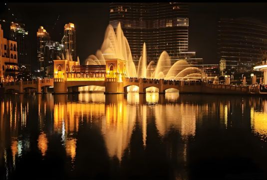 ▲ 迪拜喷泉:世界知名的音乐喷泉,位于哈利法塔脚下,免费向公众开放。喷泉喷射高度可达150米,水柱随音乐与灯光变幻舞姿,每晚多场次表演,是迪拜夜景打卡的必到之地。