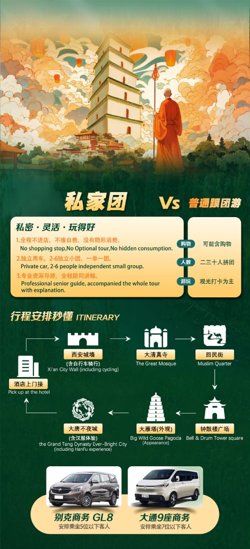 西安城墙+回民街+钟鼓楼广场+大唐不夜城一日【2-6人小团】【2-6人小团-7座别克/9座大通商务】