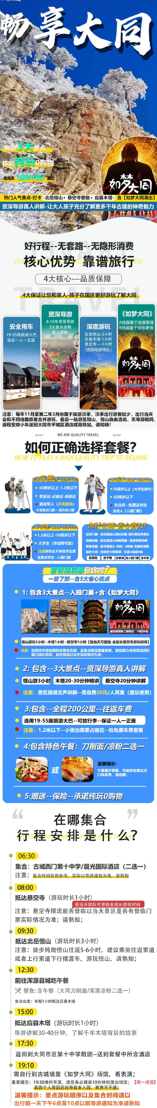 【温馨提示】:淡季出行游客较少,出行当天会和不同线路旅客合并游玩,我司会根据当天人数调整行程游览顺序,最后一站游览恒山,恒山自由活动,无导游陪同,返程安排小车送回大同市平城区酒店或高铁站。请知晓!介意者慎拍;