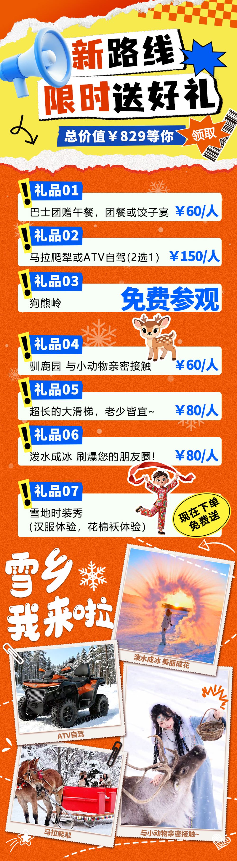 赠送马拉爬犁、ATV自驾摩托2选1,孔雀园,大雪人拍照,超长雪滑梯游玩,纯玩无购物,无任何隐形消费