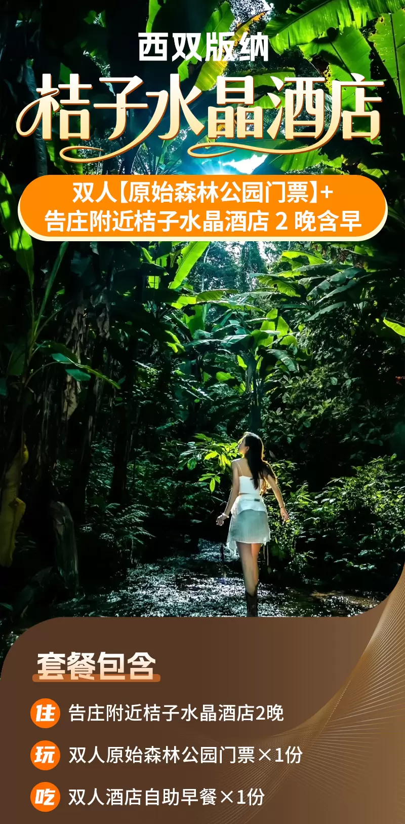 【酒店套餐】3天2晚版纳告庄附近桔子水晶酒店+双人原始森林公园门票+酒店早餐