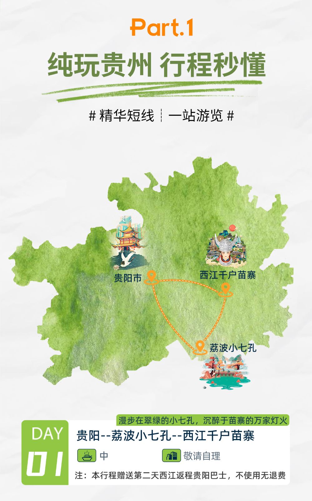 第1天出发的大巴车,第2天也要回贵阳(当天不回),可赠送您第2天跟团回贵阳,大概13:00左右集合14:00苗寨左右出发,到贵阳晚上18点左右具体时间以当天实际抵达时间为准,如不乘坐,无任何费用可退】
