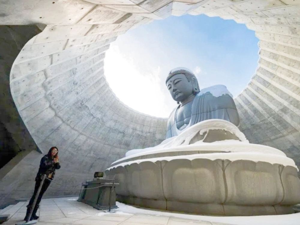 ▲ 【头大佛】 头大佛坐落于真駒内泷野灵园,是一处宁静的宗教圣地,非常适合净化身心。您不仅可以参拜庄严的佛像,感受安藤忠雄大师独特的建筑美学,旁边还矗立着神秘的复活岛石像。无论春夏秋冬,都能在这里体会自然与信仰的完美融合。
