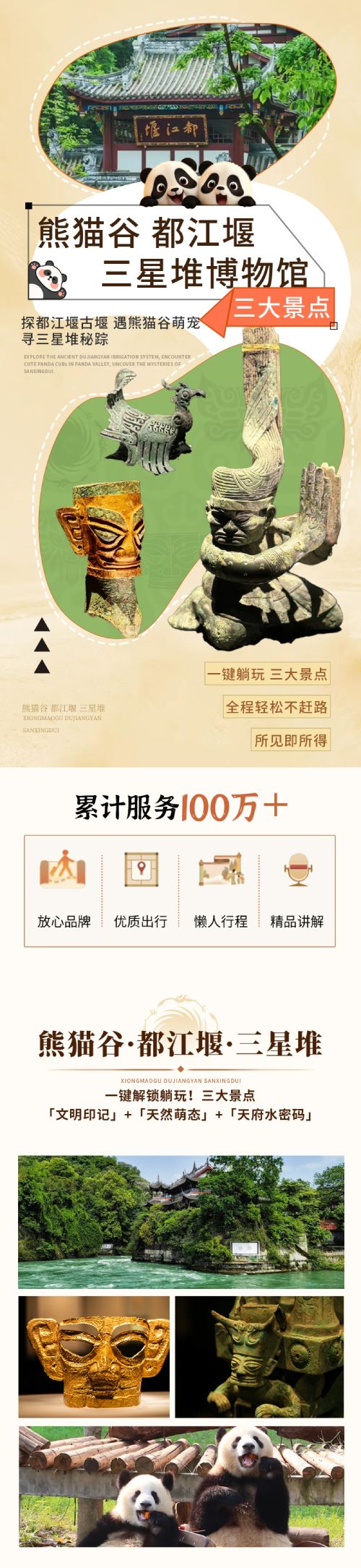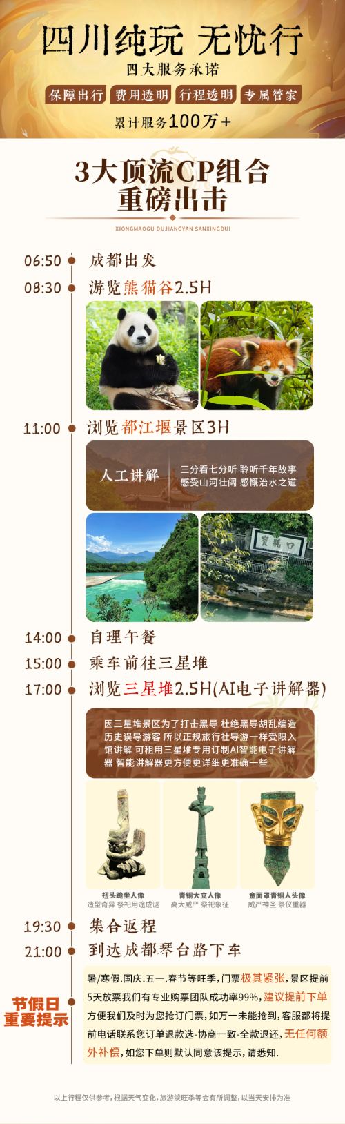 3大CP重磅组合·熊猫谷+都江堰+三星堆纯玩一日游【[品质纯玩]高端品质游,不进任何购物店,违约全款退】