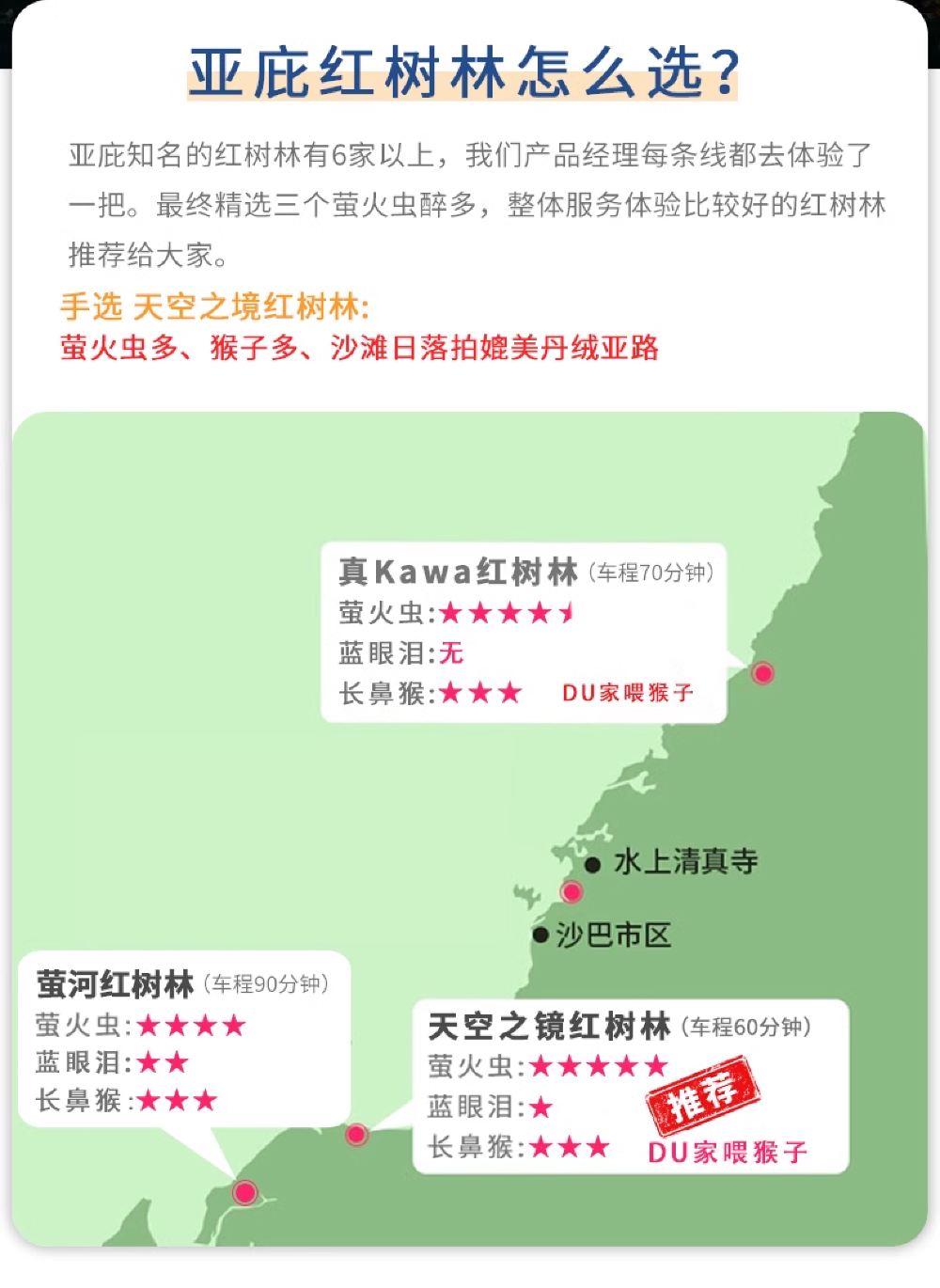 沙巴亚庇天镜红树林萤火虫长鼻猴一日游(市区接送 中文小团)【丰富内容:包含下午茶、游览红树林寻找长鼻猴、欣赏夕阳和追寻萤火虫、超多小猕猴】