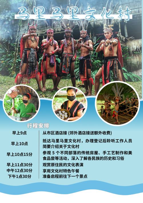 ▲按照当地原住民的习俗,再现了杜顺、龙古斯、伦达耶、巴夭、毛律文化色彩与特色房屋和生活场景。让您一窥传说中原本生性凶悍的毛律猎人头族、自在逍遥的嘉达山杜顺族人的生活作息,以及龙古斯族人著名的长屋,和宽敞的毛律族人起居空间。精彩的文化表演让您更好了解马里马里文化村,还有当地美食等您来品尝!英语导游全程陪同,带您探索每个部落。穿越过依循沙巴各原住民传统风格所兴建的建筑物,体验原始部落生活。半日行程丰富多彩,带您穿越到婆罗洲史前世纪,感受马来西亚部落风情。