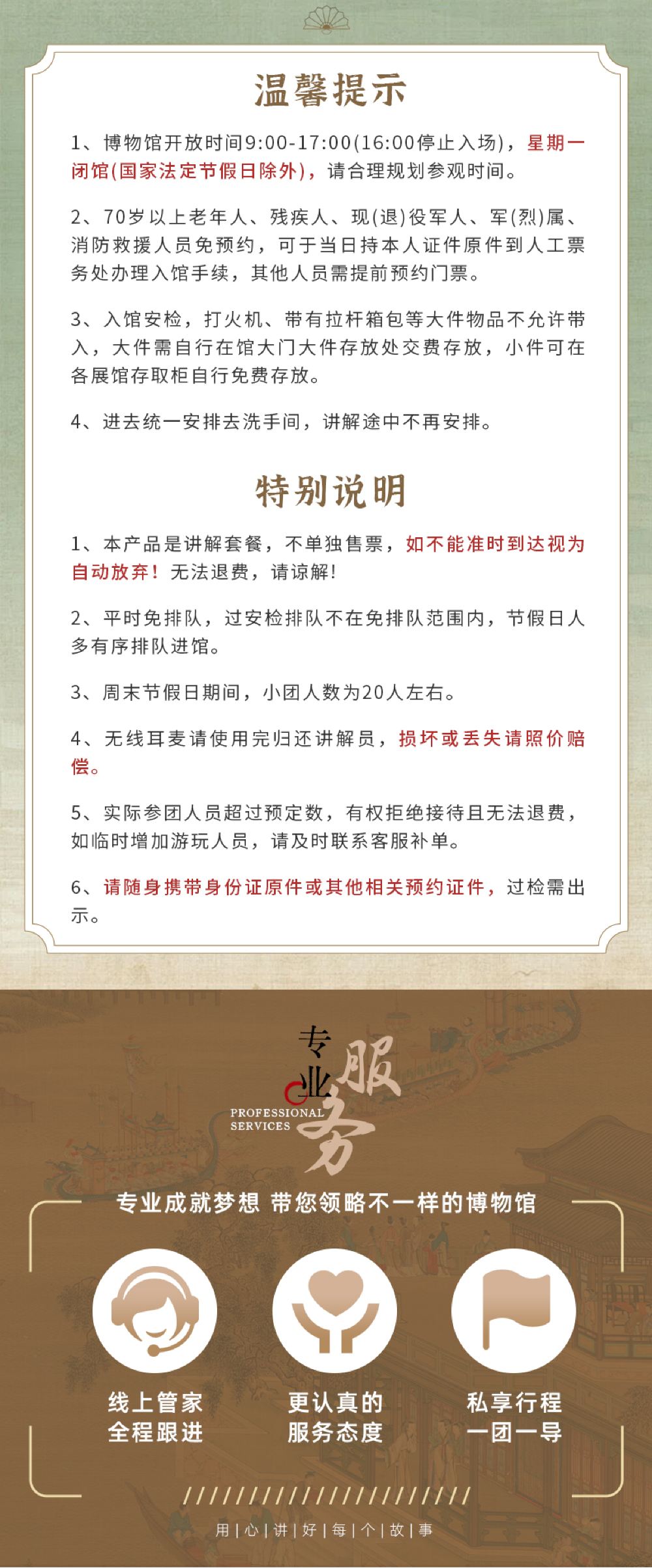 4、门票如果未能预约上,会提前一天通知您并且费用可以全额退回;商家不承担因为未预约上门票而产生的任何责任;