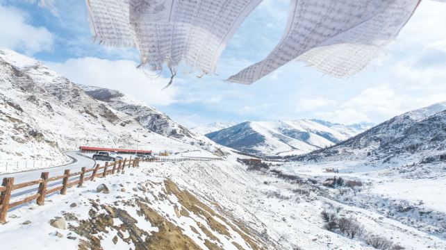 ▲ 经幡在风里抖着细碎的字,雪把山路裹成银带,远处的车停在红顶建筑旁。山尖的雪泛着冷光,连空气里都浸着高原冬日的清寂与辽阔