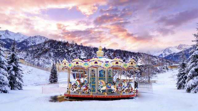 ▲ 晚霞把云染成粉紫,旋转木马的鎏金装饰在雪地里亮得晃眼。雪山做背景,雪松裹着白,这一方热闹的童话色,把冬日的冷都揉成了甜软的浪漫
