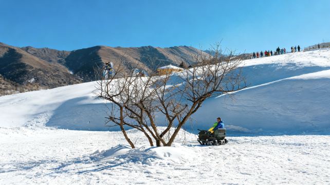 ▲ 枯树的枝桠戳在雪地里,雪上的履带车载着人往坡顶去,远处的人群挤在雪坡边。蓝天衬着褐山,冷冽的风里,连雪面的反光都带着冬日的鲜活劲儿