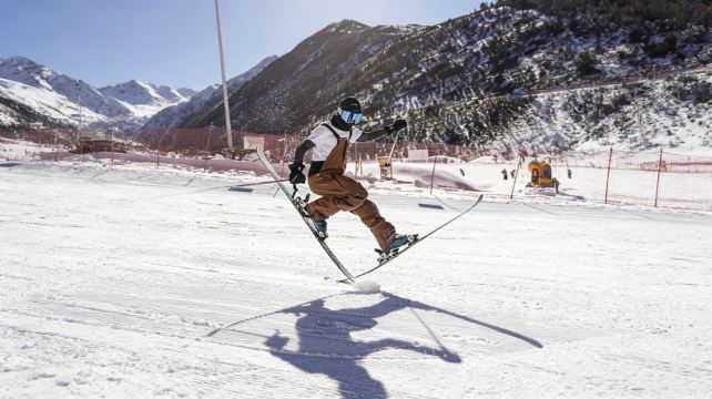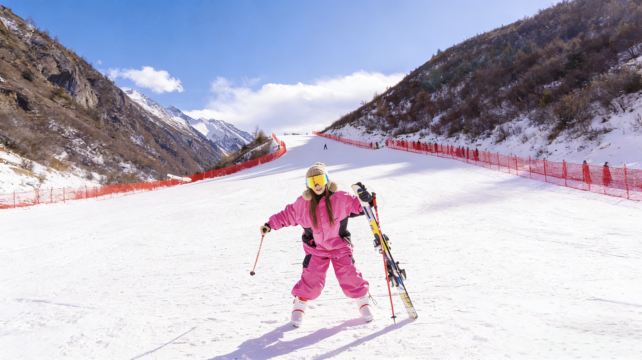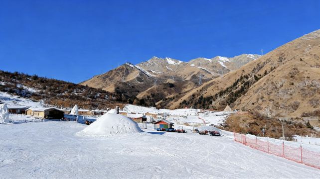 ▲ 雪场的日光裹着清冽的风,滑雪者踩着双板腾空而起,雪沫在靴边碎成星点。远处雪山的轮廓浸在蓝得透亮的天里,红网围栏把这片白生生的热闹,圈成了冬日独有的鲜活游乐场
