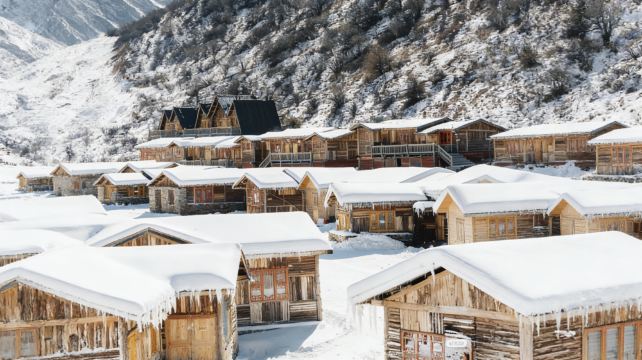 ▲ 木屋的原木色浸在雪里,檐角挂着透亮的冰棱,雪层把屋顶压出温柔的弧度。远处山壁裹着深褐的枯藤,冷冽的风里,连木屋的木纹都像藏着暖烘烘的烟火气